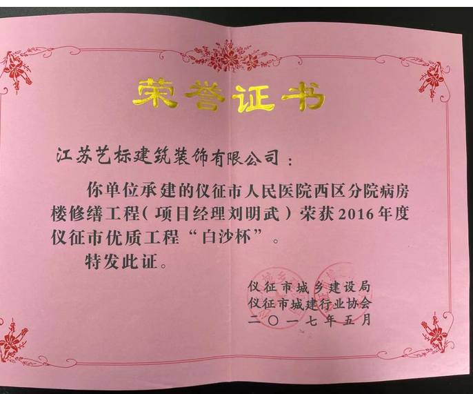 仪征市人民医院荣誉证书琼花杯